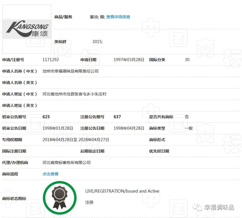 幸福調(diào)味品自創(chuàng)辦30多年以來,在工商部門指導(dǎo)下,充分認(rèn)識(shí)到商標(biāo)品牌的重要性,始終堅(jiān)持走創(chuàng)品牌的路子。公司的“康頌”商標(biāo)于1997年在30類,糖、茶、糕點(diǎn)、調(diào)味品類獲核準(zhǔn)注冊(cè)后,并根據(jù)市場需要,先后又注冊(cè)了包括“滄獅”中文及拼音在內(nèi)的等商標(biāo);形成了涵蓋多類別、多商品、多層次的商標(biāo)品牌庫。